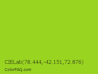 CIELab 78.444,-42.151,72.876 Color is a normal green color and the nearest color is Atlantis #97cd2d. Hex code #99d421 and RGB value is rgb(153,212,33). In RGB color space, this color is composed of 60% red, 83% green, 13% blue, In CMYK color space, this color is composed of 28% cyan, 0% magenta, 84% yellow , 17% black , In HSL color space, this color has a hue angle of 80° , 73% saturation and 48% lightness.