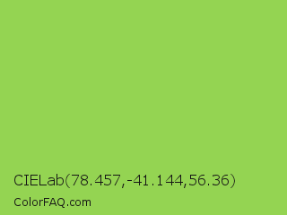 CIELab 78.457,-41.144,56.36 Color is a normal green color and the nearest color is Conifer #acdd4d. Hex code #94d452 and RGB value is rgb(148,212,82). In RGB color space, this color is composed of 58% red, 83% green, 32% blue, In CMYK color space, this color is composed of 30% cyan, 0% magenta, 61% yellow , 17% black , In HSL color space, this color has a hue angle of 90° , 60% saturation and 58% lightness.