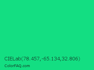 CIELab 78.457,-65.134,32.806 Color is a normal green color and the nearest color is Caribbean Green #00cc99. Hex code #13de82 and RGB value is rgb(19,222,130). In RGB color space, this color is composed of 7% red, 87% green, 51% blue, In CMYK color space, this color is composed of 91% cyan, 0% magenta, 41% yellow , 13% black , In HSL color space, this color has a hue angle of 153° , 84% saturation and 47% lightness.