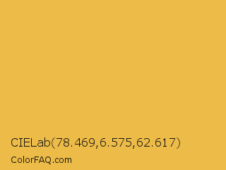 CIELab 78.469,6.575,62.617 Color is a light orange color and the nearest color is Maximum Yellow Red #f2ba49. Hex code #edbb48 and RGB value is rgb(237,187,72). In RGB color space, this color is composed of 93% red, 73% green, 28% blue, In CMYK color space, this color is composed of 0% cyan, 21% magenta, 70% yellow , 7% black , In HSL color space, this color has a hue angle of 42° , 82% saturation and 61% lightness.