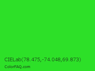 CIELab 78.475,-74.048,69.873 Color is a normal green color and the nearest color is Lime Green #32cd32. Hex code #2de028 and RGB value is rgb(45,224,40). In RGB color space, this color is composed of 18% red, 88% green, 16% blue, In CMYK color space, this color is composed of 80% cyan, 0% magenta, 82% yellow , 12% black , In HSL color space, this color has a hue angle of 118° , 75% saturation and 52% lightness.