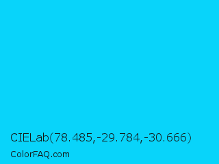 CIELab 78.485,-29.784,-30.666 Color is a normal cyan color and the nearest color is Vivid Sky Blue #00ccff. Hex code #08d4fa and RGB value is rgb(8,212,250). In RGB color space, this color is composed of 3% red, 83% green, 98% blue, In CMYK color space, this color is composed of 97% cyan, 15% magenta, 0% yellow , 2% black , In HSL color space, this color has a hue angle of 189° , 96% saturation and 51% lightness.