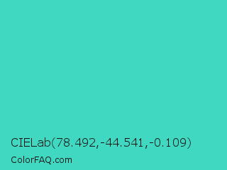 CIELab 78.492,-44.541,-0.109 Color is a normal cyan color and the nearest color is Medium Turquoise #48d1cc. Hex code #40d8c1 and RGB value is rgb(64,216,193). In RGB color space, this color is composed of 25% red, 85% green, 76% blue, In CMYK color space, this color is composed of 70% cyan, 0% magenta, 11% yellow , 15% black , In HSL color space, this color has a hue angle of 171° , 66% saturation and 55% lightness.