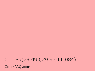 CIELab 78.493,29.93,11.084 Color is a very light red color and the nearest color is Cornflower Lilac #ffb0ac. Hex code #feadaf and RGB value is rgb(254,173,175). In RGB color space, this color is composed of 100% red, 68% green, 69% blue, In CMYK color space, this color is composed of 0% cyan, 32% magenta, 31% yellow , 0% black , In HSL color space, this color has a hue angle of 359° , 98% saturation and 84% lightness.