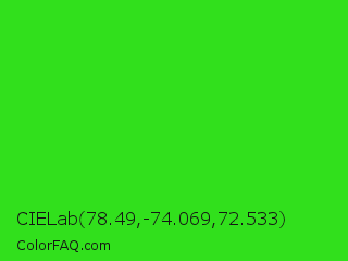 CIELab 78.49,-74.069,72.533 Color is a normal green color and the nearest color is Lime Green #32cd32. Hex code #31e01c and RGB value is rgb(49,224,28). In RGB color space, this color is composed of 19% red, 88% green, 11% blue, In CMYK color space, this color is composed of 78% cyan, 0% magenta, 88% yellow , 12% black , In HSL color space, this color has a hue angle of 114° , 78% saturation and 49% lightness.