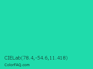 CIELab 78.4,-54.6,11.418 Color is a normal cyan color and the nearest color is Shamrock #33cc99. Hex code #1fdbab and RGB value is rgb(31,219,171). In RGB color space, this color is composed of 12% red, 86% green, 67% blue, In CMYK color space, this color is composed of 86% cyan, 0% magenta, 22% yellow , 14% black , In HSL color space, this color has a hue angle of 165° , 75% saturation and 49% lightness.