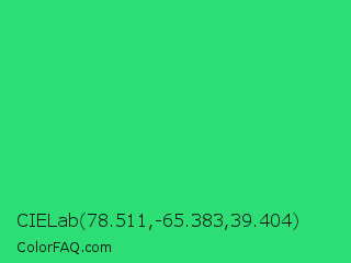 CIELab 78.511,-65.383,39.404 Color is a normal green color and the nearest color is UFO Green #3cd070. Hex code #2dde75 and RGB value is rgb(45,222,117). In RGB color space, this color is composed of 18% red, 87% green, 46% blue, In CMYK color space, this color is composed of 80% cyan, 0% magenta, 47% yellow , 13% black , In HSL color space, this color has a hue angle of 144° , 73% saturation and 52% lightness.