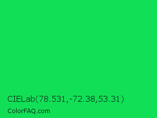 CIELab 78.531,-72.38,53.31 Color is a normal green color and the nearest color is Malachite #0bda51. Hex code #11e057 and RGB value is rgb(17,224,87). In RGB color space, this color is composed of 7% red, 88% green, 34% blue, In CMYK color space, this color is composed of 92% cyan, 0% magenta, 61% yellow , 12% black , In HSL color space, this color has a hue angle of 140° , 86% saturation and 47% lightness.