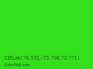 CIELab 78.532,-73.708,72.771 Color is a normal green color and the nearest color is Harlequin Green #46cb18. Hex code #34e01b and RGB value is rgb(52,224,27). In RGB color space, this color is composed of 20% red, 88% green, 11% blue, In CMYK color space, this color is composed of 77% cyan, 0% magenta, 88% yellow , 12% black , In HSL color space, this color has a hue angle of 112° , 78% saturation and 49% lightness.
