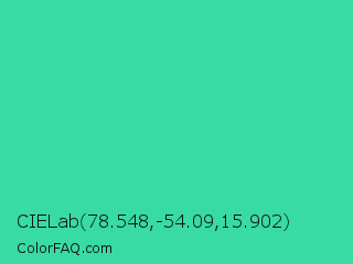 CIELab 78.548,-54.09,15.902 Color is a normal green color and the nearest color is Eucalyptus #44d7a8. Hex code #38dba3 and RGB value is rgb(56,219,163). In RGB color space, this color is composed of 22% red, 86% green, 64% blue, In CMYK color space, this color is composed of 74% cyan, 0% magenta, 26% yellow , 14% black , In HSL color space, this color has a hue angle of 159° , 69% saturation and 54% lightness.