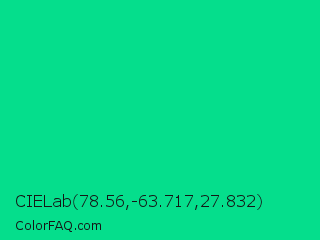 CIELab 78.56,-63.717,27.832 Color is a normal green color and the nearest color is Caribbean Green #00cc99. Hex code #05de8c and RGB value is rgb(5,222,140). In RGB color space, this color is composed of 2% red, 87% green, 55% blue, In CMYK color space, this color is composed of 98% cyan, 0% magenta, 37% yellow , 13% black , In HSL color space, this color has a hue angle of 157° , 96% saturation and 45% lightness.