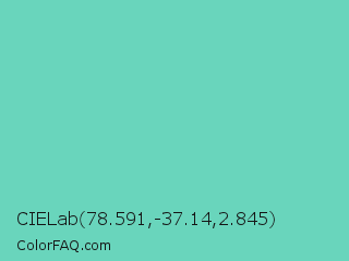 CIELab 78.591,-37.14,2.845 Color is a light cyan color and the nearest color is Downy #6fd0c5. Hex code #69d5bc and RGB value is rgb(105,213,188). In RGB color space, this color is composed of 41% red, 84% green, 74% blue, In CMYK color space, this color is composed of 51% cyan, 0% magenta, 12% yellow , 16% black , In HSL color space, this color has a hue angle of 166° , 56% saturation and 62% lightness.
