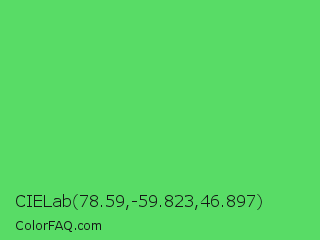 CIELab 78.59,-59.823,46.897 Color is a normal green color and the nearest color is Emerald #50c878. Hex code #58dc66 and RGB value is rgb(88,220,102). In RGB color space, this color is composed of 35% red, 86% green, 40% blue, In CMYK color space, this color is composed of 60% cyan, 0% magenta, 54% yellow , 14% black , In HSL color space, this color has a hue angle of 126° , 65% saturation and 60% lightness.