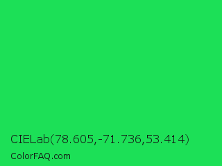 CIELab 78.605,-71.736,53.414 Color is a normal green color and the nearest color is Malachite #0bda51. Hex code #1ce057 and RGB value is rgb(28,224,87). In RGB color space, this color is composed of 11% red, 88% green, 34% blue, In CMYK color space, this color is composed of 88% cyan, 0% magenta, 61% yellow , 12% black , In HSL color space, this color has a hue angle of 138° , 78% saturation and 49% lightness.