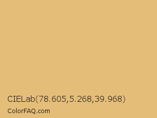 CIELab 78.605,5.268,39.968 Color is a light orange color and the nearest color is Harvest Gold #e0b974. Hex code #e4bd78 and RGB value is rgb(228,189,120). In RGB color space, this color is composed of 89% red, 74% green, 47% blue, In CMYK color space, this color is composed of 0% cyan, 17% magenta, 47% yellow , 11% black , In HSL color space, this color has a hue angle of 38° , 67% saturation and 68% lightness.