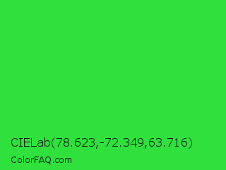 CIELab 78.623,-72.349,63.716 Color is a normal green color and the nearest color is Lime Green #32cd32. Hex code #30e03d and RGB value is rgb(48,224,61). In RGB color space, this color is composed of 19% red, 88% green, 24% blue, In CMYK color space, this color is composed of 79% cyan, 0% magenta, 73% yellow , 12% black , In HSL color space, this color has a hue angle of 124° , 74% saturation and 53% lightness.