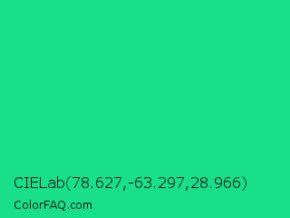 CIELab 78.627,-63.297,28.966 Color is a normal green color and the nearest color is Caribbean Green #00cc99. Hex code #19de8a and RGB value is rgb(25,222,138). In RGB color space, this color is composed of 10% red, 87% green, 54% blue, In CMYK color space, this color is composed of 89% cyan, 0% magenta, 38% yellow , 13% black , In HSL color space, this color has a hue angle of 154° , 80% saturation and 48% lightness.