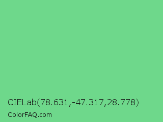 CIELab 78.631,-47.317,28.778 Color is a light green color and the nearest color is Very Light Malachite Green #64e986. Hex code #6ed88b and RGB value is rgb(110,216,139). In RGB color space, this color is composed of 43% red, 85% green, 55% blue, In CMYK color space, this color is composed of 49% cyan, 0% magenta, 36% yellow , 15% black , In HSL color space, this color has a hue angle of 136° , 58% saturation and 64% lightness.