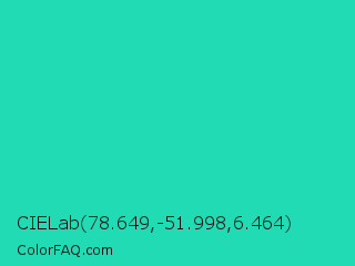 CIELab 78.649,-51.998,6.464 Color is a normal cyan color and the nearest color is Turquoise PWG #30d5c8. Hex code #21dbb5 and RGB value is rgb(33,219,181). In RGB color space, this color is composed of 13% red, 86% green, 71% blue, In CMYK color space, this color is composed of 85% cyan, 0% magenta, 17% yellow , 14% black , In HSL color space, this color has a hue angle of 168° , 74% saturation and 49% lightness.