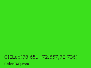 CIELab 78.651,-72.657,72.736 Color is a normal green color and the nearest color is Harlequin Green #46cb18. Hex code #3be01c and RGB value is rgb(59,224,28). In RGB color space, this color is composed of 23% red, 88% green, 11% blue, In CMYK color space, this color is composed of 74% cyan, 0% magenta, 88% yellow , 12% black , In HSL color space, this color has a hue angle of 111° , 78% saturation and 49% lightness.