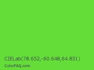 CIELab 78.652,-60.648,64.851 Color is a normal green color and the nearest color is Kiwi #8ee53f. Hex code #66dc3b and RGB value is rgb(102,220,59). In RGB color space, this color is composed of 40% red, 86% green, 23% blue, In CMYK color space, this color is composed of 54% cyan, 0% magenta, 73% yellow , 14% black , In HSL color space, this color has a hue angle of 104° , 70% saturation and 55% lightness.