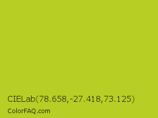 CIELab 78.658,-27.418,73.125 Color is a normal yellow color and the nearest color is Key Lime Pie #bfc921. Hex code #b7ce24 and RGB value is rgb(183,206,36). In RGB color space, this color is composed of 72% red, 81% green, 14% blue, In CMYK color space, this color is composed of 11% cyan, 0% magenta, 83% yellow , 19% black , In HSL color space, this color has a hue angle of 68° , 70% saturation and 47% lightness.