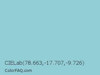 CIELab 78.663,-17.707,-9.726 Color is a light cyan color and the nearest color is Middle Blue Green #8dd9cc. Hex code #90cdd4 and RGB value is rgb(144,205,212). In RGB color space, this color is composed of 56% red, 80% green, 83% blue, In CMYK color space, this color is composed of 32% cyan, 3% magenta, 0% yellow , 17% black , In HSL color space, this color has a hue angle of 186° , 44% saturation and 70% lightness.