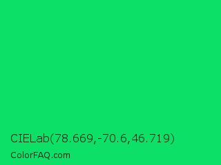 CIELab 78.669,-70.6,46.719 Color is a normal green color and the nearest color is Malachite #0bda51. Hex code #0de066 and RGB value is rgb(13,224,102). In RGB color space, this color is composed of 5% red, 88% green, 40% blue, In CMYK color space, this color is composed of 94% cyan, 0% magenta, 54% yellow , 12% black , In HSL color space, this color has a hue angle of 145° , 89% saturation and 46% lightness.