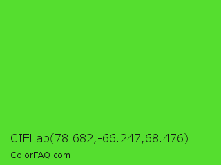 CIELab 78.682,-66.247,68.476 Color is a normal green color and the nearest color is Harlequin Green #46cb18. Hex code #55de2f and RGB value is rgb(85,222,47). In RGB color space, this color is composed of 33% red, 87% green, 18% blue, In CMYK color space, this color is composed of 62% cyan, 0% magenta, 79% yellow , 13% black , In HSL color space, this color has a hue angle of 107° , 73% saturation and 53% lightness.