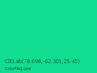 CIELab 78.698,-62.301,25.45 Color is a normal green color and the nearest color is Caribbean Green #00cc99. Hex code #11de91 and RGB value is rgb(17,222,145). In RGB color space, this color is composed of 7% red, 87% green, 57% blue, In CMYK color space, this color is composed of 92% cyan, 0% magenta, 35% yellow , 13% black , In HSL color space, this color has a hue angle of 157° , 86% saturation and 47% lightness.