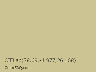 CIELab 78.69,-4.977,26.168 Color is a light yellow color and the nearest color is Yuma #cec291. Hex code #ccc492 and RGB value is rgb(204,196,146). In RGB color space, this color is composed of 80% red, 77% green, 57% blue, In CMYK color space, this color is composed of 0% cyan, 4% magenta, 28% yellow , 20% black , In HSL color space, this color has a hue angle of 52° , 36% saturation and 69% lightness.