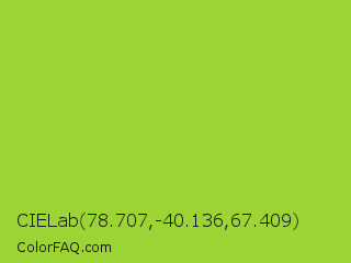 CIELab 78.707,-40.136,67.409 Color is a normal green color and the nearest color is Yellow Green #9acd32. Hex code #9cd436 and RGB value is rgb(156,212,54). In RGB color space, this color is composed of 61% red, 83% green, 21% blue, In CMYK color space, this color is composed of 26% cyan, 0% magenta, 75% yellow , 17% black , In HSL color space, this color has a hue angle of 81° , 65% saturation and 52% lightness.