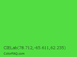 CIELab 78.712,-65.611,62.235 Color is a normal green color and the nearest color is Lime Green #32cd32. Hex code #52de42 and RGB value is rgb(82,222,66). In RGB color space, this color is composed of 32% red, 87% green, 26% blue, In CMYK color space, this color is composed of 63% cyan, 0% magenta, 70% yellow , 13% black , In HSL color space, this color has a hue angle of 114° , 70% saturation and 56% lightness.