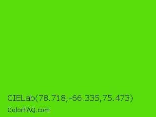 CIELab 78.718,-66.335,75.473 Color is a normal green color and the nearest color is Harlequin Green #46cb18. Hex code #5ade0b and RGB value is rgb(90,222,11). In RGB color space, this color is composed of 35% red, 87% green, 4% blue, In CMYK color space, this color is composed of 59% cyan, 0% magenta, 95% yellow , 13% black , In HSL color space, this color has a hue angle of 98° , 91% saturation and 46% lightness.