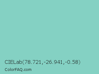 CIELab 78.721,-26.941,-0.58 Color is a light cyan color and the nearest color is Monte Carlo #83d0c6. Hex code #84d1c3 and RGB value is rgb(132,209,195). In RGB color space, this color is composed of 52% red, 82% green, 76% blue, In CMYK color space, this color is composed of 37% cyan, 0% magenta, 7% yellow , 18% black , In HSL color space, this color has a hue angle of 169° , 46% saturation and 67% lightness.