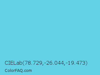 CIELab 78.729,-26.044,-19.473 Color is a light cyan color and the nearest color is Turquoise Blue #6cdae7. Hex code #63d2e6 and RGB value is rgb(99,210,230). In RGB color space, this color is composed of 39% red, 82% green, 90% blue, In CMYK color space, this color is composed of 57% cyan, 9% magenta, 0% yellow , 10% black , In HSL color space, this color has a hue angle of 189° , 72% saturation and 65% lightness.