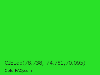 CIELab 78.738,-74.781,70.095 Color is a normal green color and the nearest color is Lime Green #32cd32. Hex code #29e128 and RGB value is rgb(41,225,40). In RGB color space, this color is composed of 16% red, 88% green, 16% blue, In CMYK color space, this color is composed of 82% cyan, 0% magenta, 82% yellow , 12% black , In HSL color space, this color has a hue angle of 120° , 76% saturation and 52% lightness.