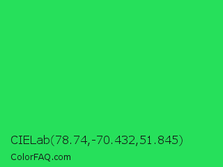 CIELab 78.74,-70.432,51.845 Color is a normal green color and the nearest color is Malachite #0bda51. Hex code #26e05b and RGB value is rgb(38,224,91). In RGB color space, this color is composed of 15% red, 88% green, 36% blue, In CMYK color space, this color is composed of 83% cyan, 0% magenta, 59% yellow , 12% black , In HSL color space, this color has a hue angle of 137° , 75% saturation and 51% lightness.