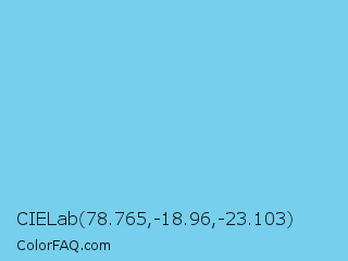 CIELab 78.765,-18.96,-23.103 Color is a light blue color and the nearest color is Sky Blue #76d7ea. Hex code #75cfed and RGB value is rgb(117,207,237). In RGB color space, this color is composed of 46% red, 81% green, 93% blue, In CMYK color space, this color is composed of 51% cyan, 13% magenta, 0% yellow , 7% black , In HSL color space, this color has a hue angle of 195° , 77% saturation and 69% lightness.