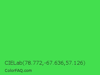 CIELab 78.772,-67.636,57.126 Color is a normal green color and the nearest color is UFO Green #3cd070. Hex code #43df4f and RGB value is rgb(67,223,79). In RGB color space, this color is composed of 26% red, 87% green, 31% blue, In CMYK color space, this color is composed of 70% cyan, 0% magenta, 65% yellow , 13% black , In HSL color space, this color has a hue angle of 125° , 71% saturation and 57% lightness.