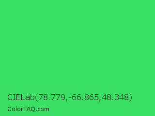 CIELab 78.779,-66.865,48.348 Color is a normal green color and the nearest color is UFO Green #3cd070. Hex code #39df63 and RGB value is rgb(57,223,99). In RGB color space, this color is composed of 22% red, 87% green, 39% blue, In CMYK color space, this color is composed of 74% cyan, 0% magenta, 56% yellow , 13% black , In HSL color space, this color has a hue angle of 135° , 72% saturation and 55% lightness.