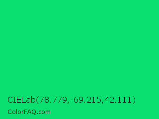 CIELab 78.779,-69.215,42.111 Color is a normal green color and the nearest color is Malachite #0bda51. Hex code #0ae070 and RGB value is rgb(10,224,112). In RGB color space, this color is composed of 4% red, 88% green, 44% blue, In CMYK color space, this color is composed of 96% cyan, 0% magenta, 50% yellow , 12% black , In HSL color space, this color has a hue angle of 149° , 91% saturation and 46% lightness.