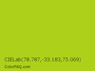 CIELab 78.787,-33.183,75.069 Color is a normal lime color and the nearest color is Bahia #a5cb0c. Hex code #add11a and RGB value is rgb(173,209,26). In RGB color space, this color is composed of 68% red, 82% green, 10% blue, In CMYK color space, this color is composed of 17% cyan, 0% magenta, 88% yellow , 18% black , In HSL color space, this color has a hue angle of 72° , 78% saturation and 46% lightness.