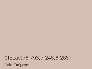 CIELab 78.793,7.248,8.285 Color is a light orange color and the nearest color is Clam Shell #d4b6af. Hex code #d7beb4 and RGB value is rgb(215,190,180). In RGB color space, this color is composed of 84% red, 75% green, 71% blue, In CMYK color space, this color is composed of 0% cyan, 12% magenta, 16% yellow , 16% black , In HSL color space, this color has a hue angle of 17° , 30% saturation and 77% lightness.