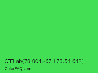 CIELab 78.804,-67.173,54.642 Color is a normal green color and the nearest color is UFO Green #3cd070. Hex code #42df55 and RGB value is rgb(66,223,85). In RGB color space, this color is composed of 26% red, 87% green, 33% blue, In CMYK color space, this color is composed of 70% cyan, 0% magenta, 62% yellow , 13% black , In HSL color space, this color has a hue angle of 127° , 71% saturation and 57% lightness.