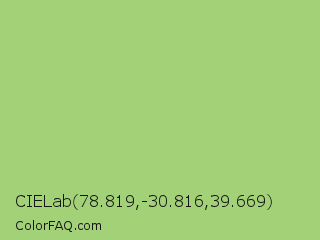 CIELab 78.819,-30.816,39.669 Color is a light green color and the nearest color is Pistachio #93c572. Hex code #a2d177 and RGB value is rgb(162,209,119). In RGB color space, this color is composed of 64% red, 82% green, 47% blue, In CMYK color space, this color is composed of 22% cyan, 0% magenta, 43% yellow , 18% black , In HSL color space, this color has a hue angle of 91° , 49% saturation and 64% lightness.