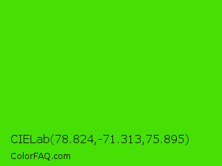 CIELab 78.824,-71.313,75.895 Color is a normal green color and the nearest color is Harlequin Green #46cb18. Hex code #46e005 and RGB value is rgb(70,224,5). In RGB color space, this color is composed of 27% red, 88% green, 2% blue, In CMYK color space, this color is composed of 69% cyan, 0% magenta, 98% yellow , 12% black , In HSL color space, this color has a hue angle of 102° , 96% saturation and 45% lightness.