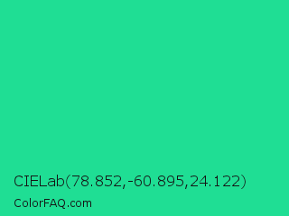 CIELab 78.852,-60.895,24.122 Color is a normal green color and the nearest color is Shamrock #33cc99. Hex code #1fde94 and RGB value is rgb(31,222,148). In RGB color space, this color is composed of 12% red, 87% green, 58% blue, In CMYK color space, this color is composed of 86% cyan, 0% magenta, 33% yellow , 13% black , In HSL color space, this color has a hue angle of 157° , 75% saturation and 50% lightness.