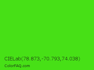 CIELab 78.873,-70.793,74.038 Color is a normal green color and the nearest color is Harlequin Green #46cb18. Hex code #47e016 and RGB value is rgb(71,224,22). In RGB color space, this color is composed of 28% red, 88% green, 9% blue, In CMYK color space, this color is composed of 68% cyan, 0% magenta, 90% yellow , 12% black , In HSL color space, this color has a hue angle of 105° , 82% saturation and 48% lightness.