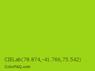 CIELab 78.874,-41.766,75.542 Color is a normal lime color and the nearest color is Bahia #a5cb0c. Hex code #9cd515 and RGB value is rgb(156,213,21). In RGB color space, this color is composed of 61% red, 84% green, 8% blue, In CMYK color space, this color is composed of 27% cyan, 0% magenta, 90% yellow , 16% black , In HSL color space, this color has a hue angle of 78° , 82% saturation and 46% lightness.